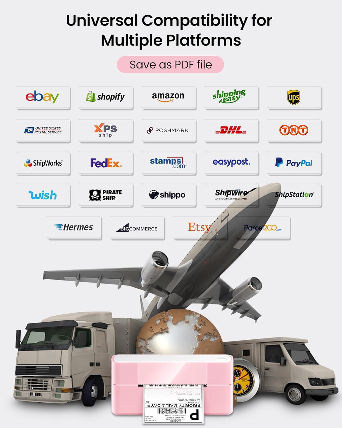 • Wide Application: This label printer for small business works with virtually all platforms like Amazon, Ebay, Shopify, USPS, UPS, Esty, PayPal, DHL, FedEx, etc. Besides, our desktop usps label printers prints labels from 1 to 4.6 inches wide for text, images, barcodes, QR codes, forms, holiday cards, and thank you cards. It has lots of icons and templates for both commercial and home use, boosting your efficiency
