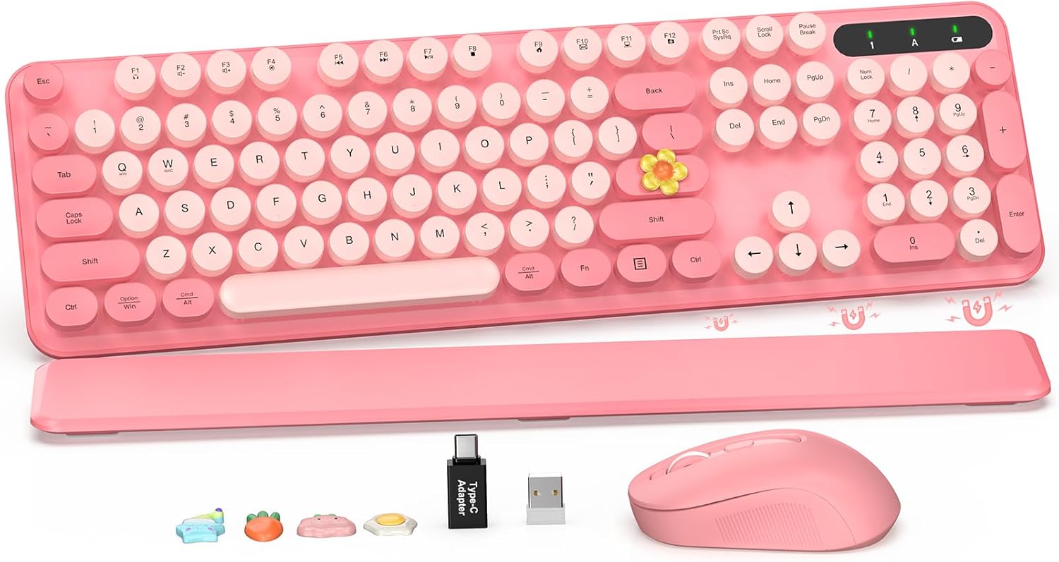 Wireless Keyboard and Mouse Combo - Retro Keyboard with Round Keycaps, Full-Size Typewriter Keyboard with Detachable Wrist Rest, 2.4GHz Connection for Mac/Windows/PC (Baby Pink)