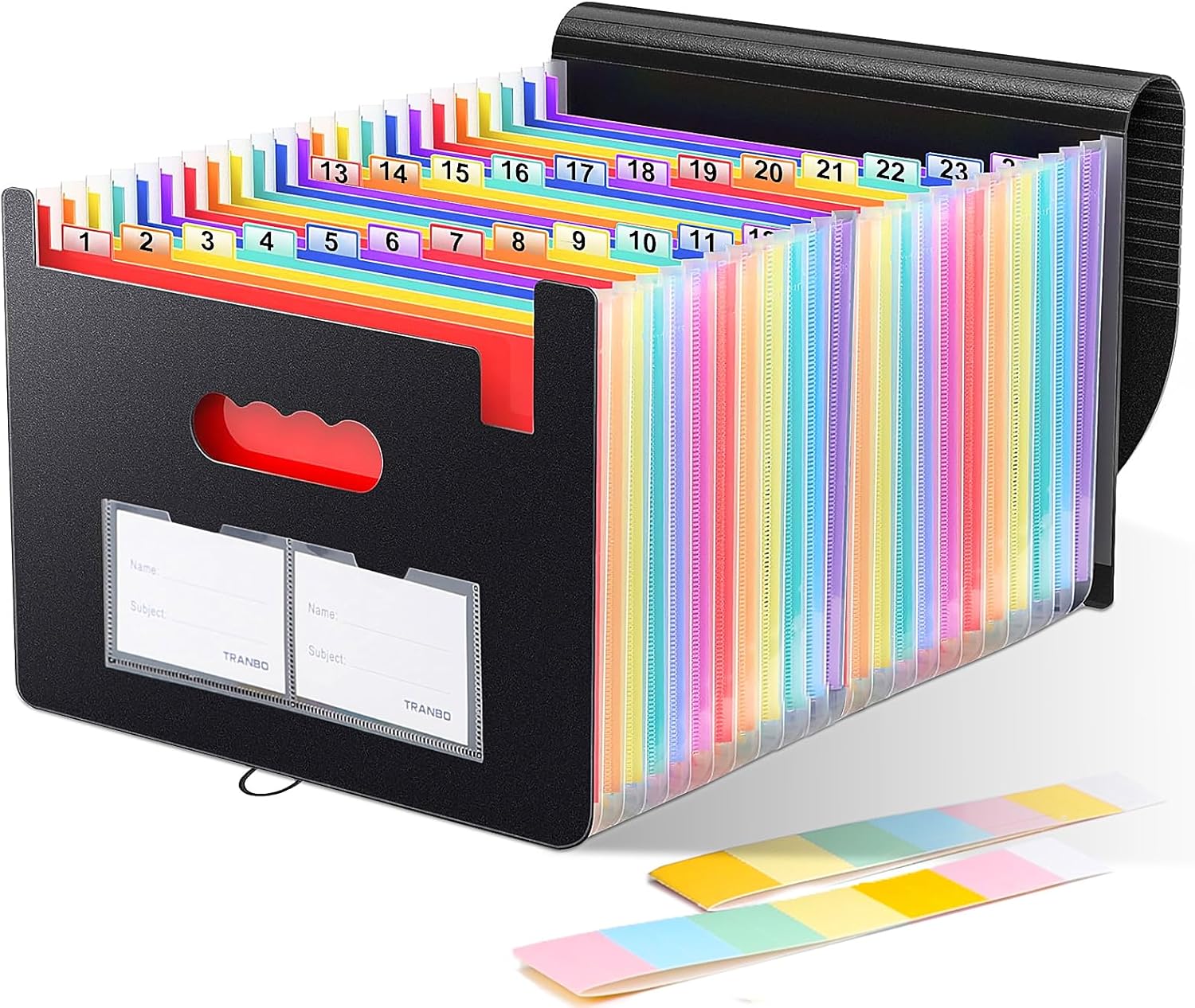 Accordion File Organizer, 24 Pockets Expanding File Folders, Portable Letter A4 Size Filing Box with Colored Labels and Expandable Cover, Monthly Bill Receipt Documents Organizer Black