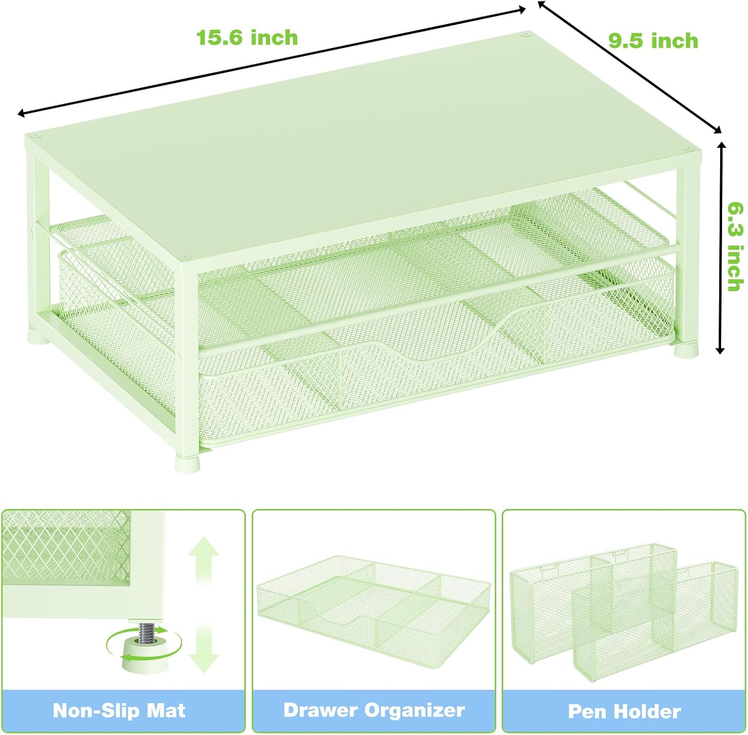 Desk Organizers and Accessories, 2-Tier Computer Monitor Stand Riser with Drawer and 2 Pen Holders, Laptop Stand, Office Desk Accessories for Office Supplies, Green