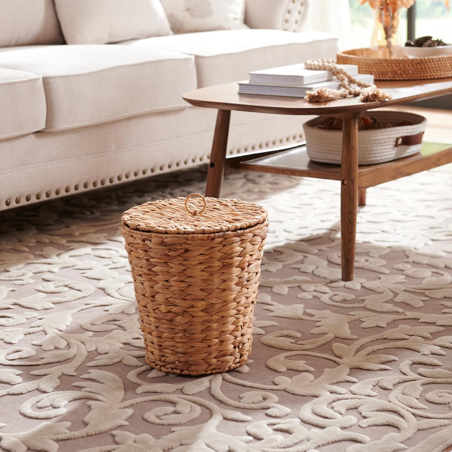 YANGQIHOME Wicker Trash Can with Lid, Water Hyacinth Garbage Can, Handwoven Wicker Waste Basket in Bathroom, Bedroom, Office, Living Room, Laundry Room, Blanket Basket 3.8 Gallon