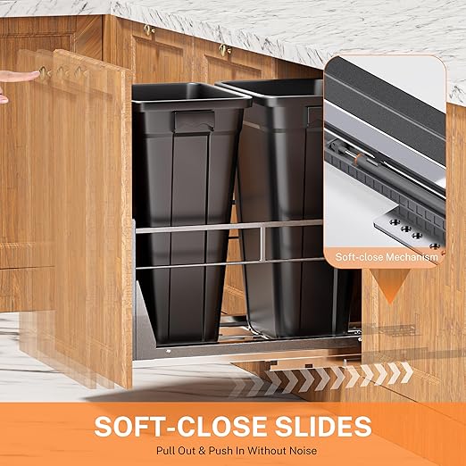 • Smooth Sliding Trash Can: Under cabinet trash can pull out with a soft-close mechanism, allowing the waste container to fully extend outside the cabinet for easy access. Continuous bearings ensure smooth and quiet operation, reducing noise during opening and closing for a more peaceful home environment.