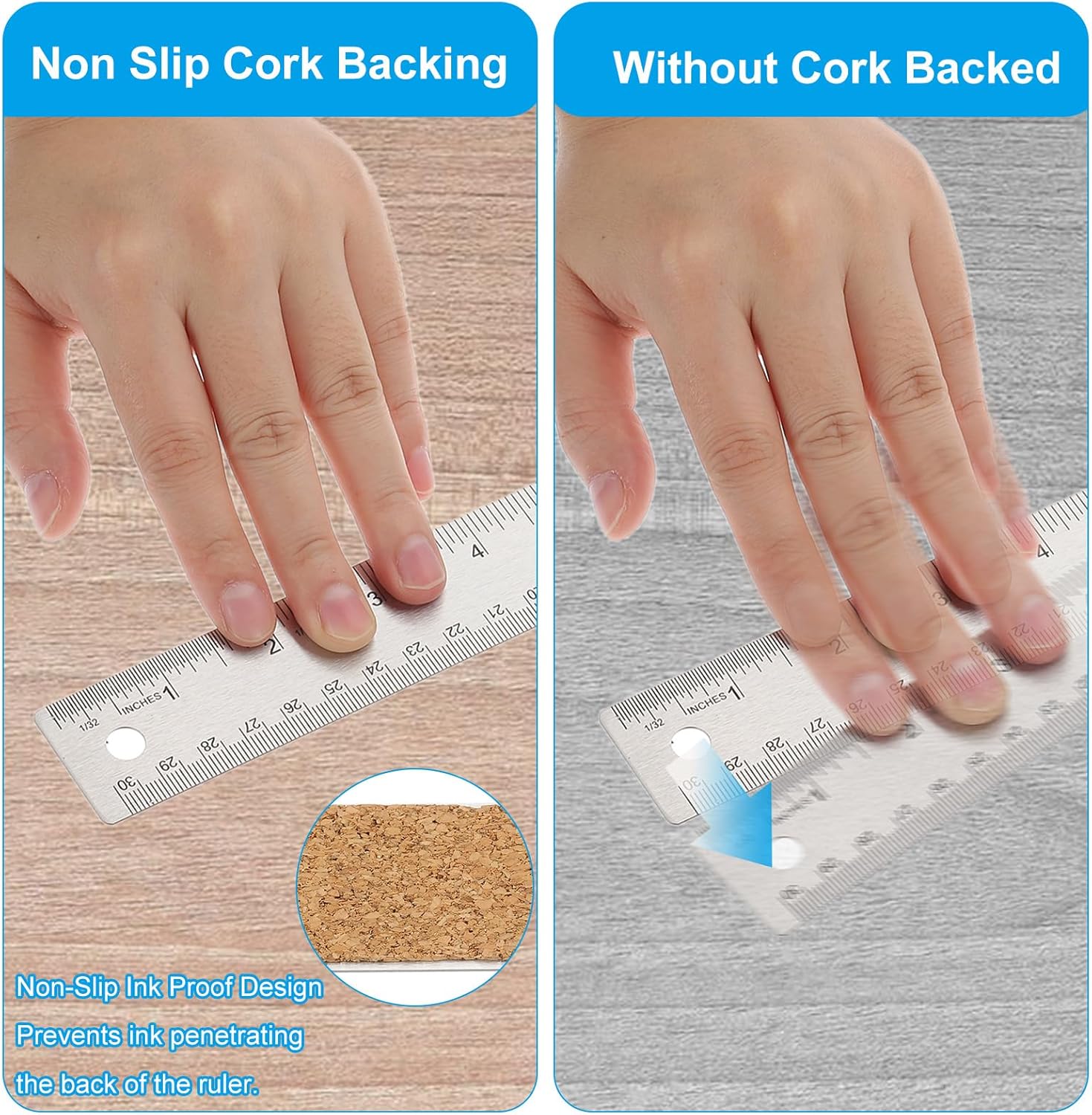 • Instruction: Non-slip cork backed design, keeps the ruler from slipping around when drawing straight lines on slippery materials, it can also effectively prevent the ink from penetrating the back of the ruler while drawing.