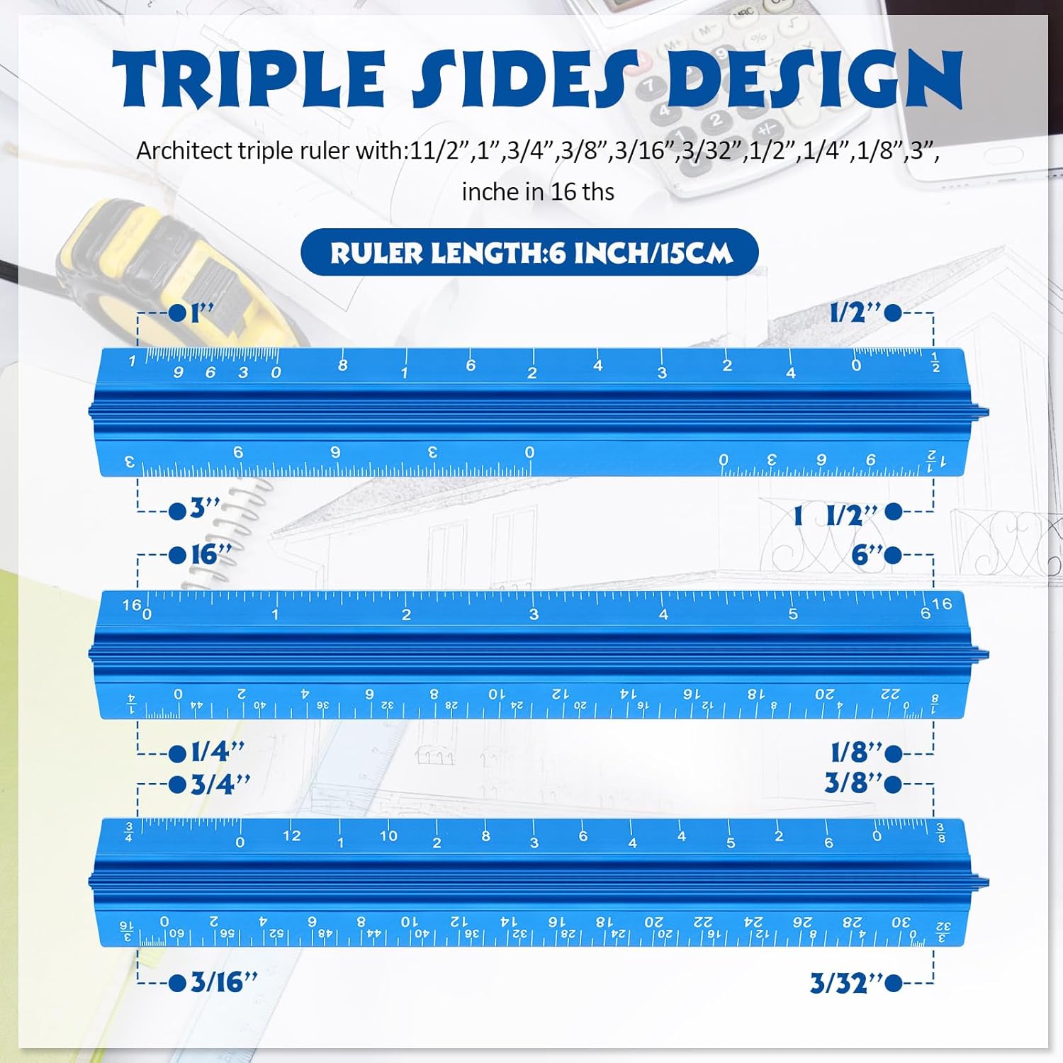 • Versatile Imperial Scale Options: features a range of imperial measurements, including 1-1/2, 1, 3/4, 3/8, 3/16, 3/32, 1/2, 1/4, 1/8, and 3, making this architectural ruler a practical tool for architects, engineers, and artists requiring accurate measurements