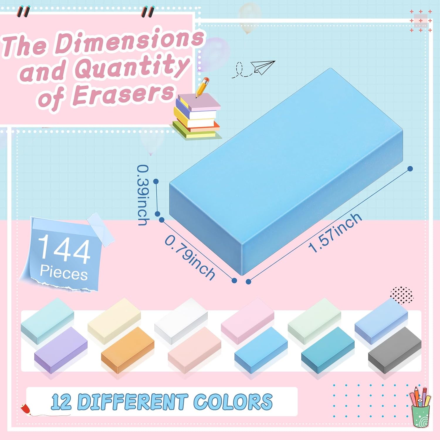 • Back to School Erasers Bulk: includes 144 pieces of classroom erasers in 12 different colors, 12 pcs for each color, cool and eye catching, enough for school to use, and you can also share with students, teachers, office workers