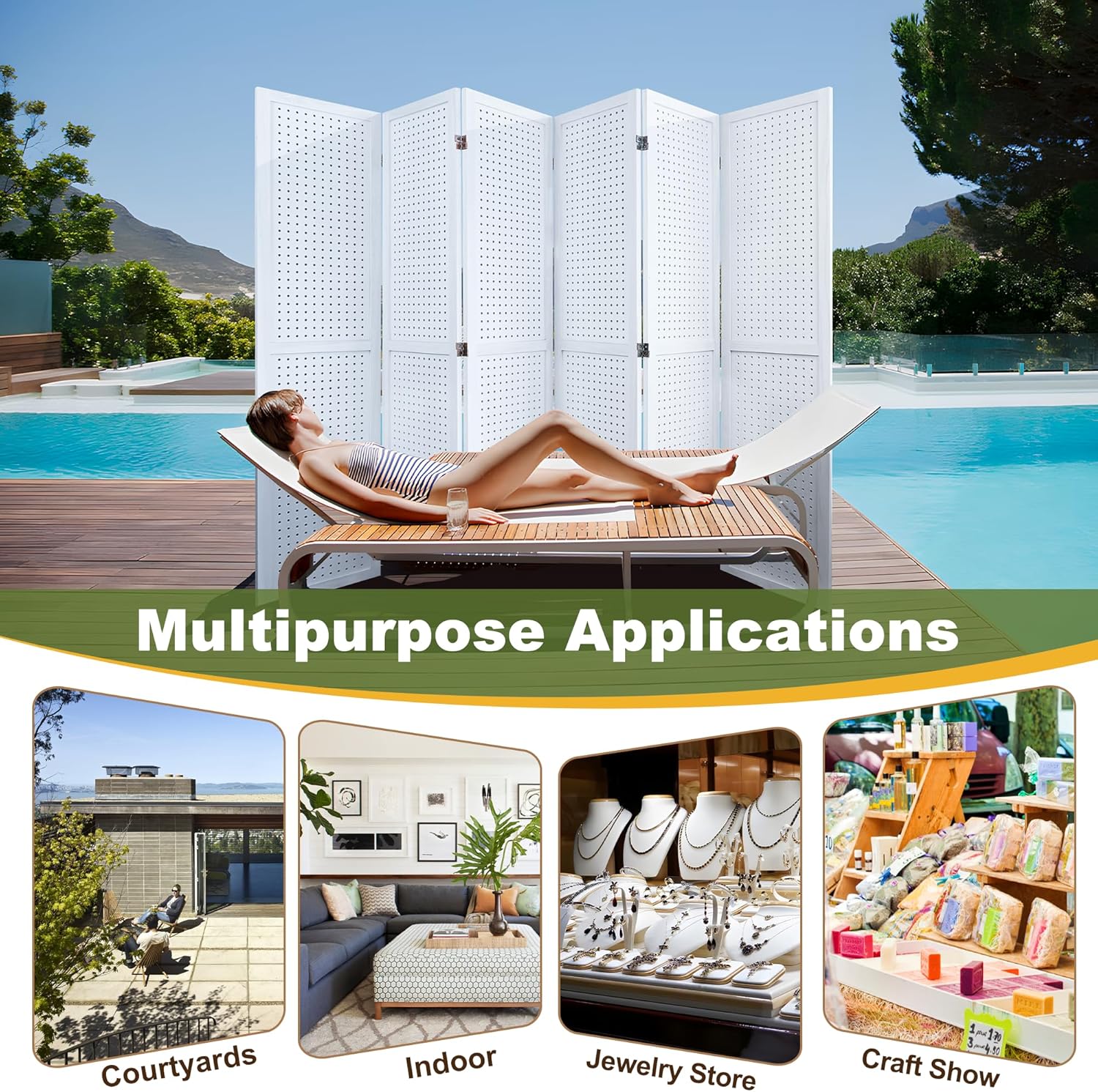 • Versatile Pegboard Panel Design:Our pegboard panel features 0.3-inch diameter holes spaced 1 inch apart, compatible with various peg hooks. This room divider doubles as a decorative folding privacy screen or wall organizer, and serves as a freestanding display panel for trade shows, craft fairs, department stores, and more.