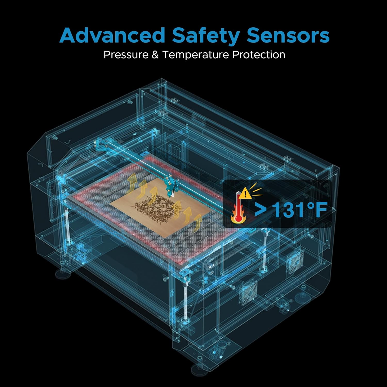 • Safety at the Forefront: Dual safety mechanisms on the front cover and waste box ensure secure operation. Integrated pressure and temperature sensors provide real-time monitoring, minimizing fire risks—so you can engrave with confidence