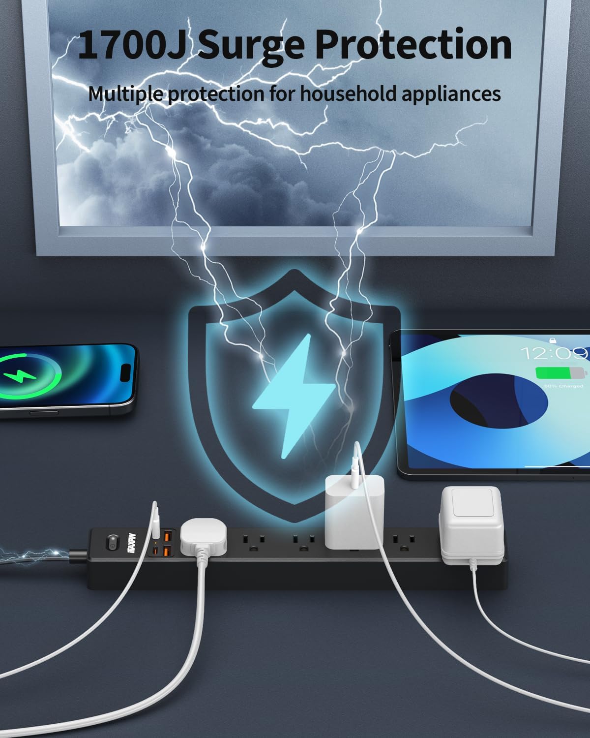 • 【Handles All Your Needs】- Our 10-foot power strip features 7 sockets and 4 USB slots (including 2 Type-C), transforming a single outlet into 11. Power up to 11 devices simultaneously, saving you valuable time and streamlining your setup.