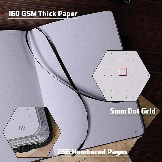 • 160 GSM Thick Paper: The dot matrix journal is made of 160gsm extra thick paper, drawing and writing won’t penetrate the ink, this is tested by us, the writing surface is white and acid-free, there are 256 pages, each page is numbered, the dots are 0.5 cm, leaving enough space for your imagination.