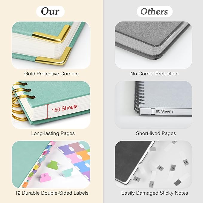 • 【Premium Leather Cover & Strong Binding】Spiral notebook showcases a luxurious leather hard cover, complete with golden corner protectors for extra durability. Its professional design not only looks stylish but is built to last. The strong metal double spiral binding allows for a full 360° lay-flat design, making writing more comfortable and efficient. Whether flipping through or laying the Subject notebook flat, this design guarantees a smooth writing experience.