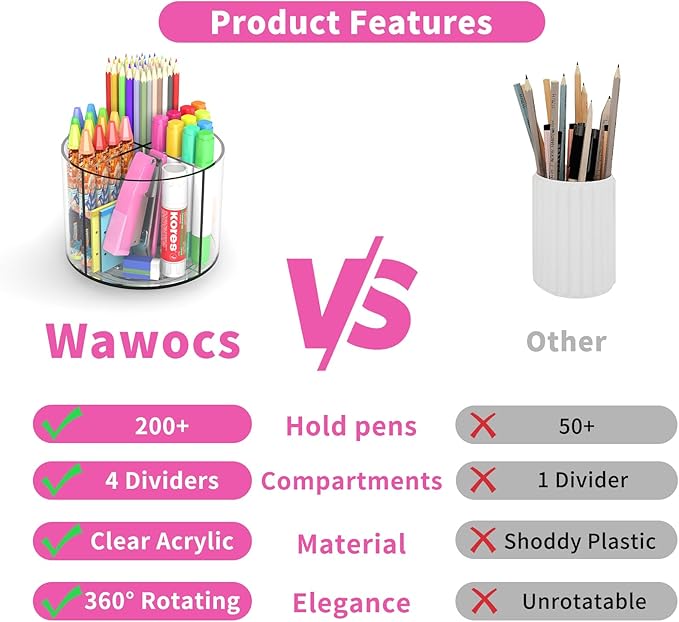 • Clear Spinning Marker Holder Organizer: Wawocs rotating acrylic clear desk top pencil and pen organizer is not only suitable for your own use but also a great organizer for kids partners family friends teachers business partners; the acrylic arts and crafts organizer is delicate and durable, ideal for desks workstations podiums dressing tables