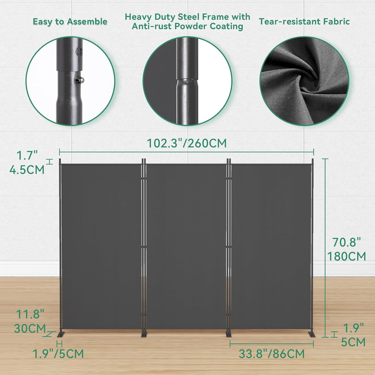 Helios&Hestia 3-Panel 6 ft Tall Indoor Folding Room Divider, Portable Privacy Screen, Freestanding Partition Separator, Temporary Wall Separation for Bedroom, Office, 102" W X 71" H, Dark Grey
