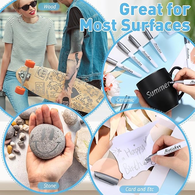 • Multi-surface Use: the metallic paint marker can be written on most light and dark surfaces, such as black card paper or greeting cards, wood, walls, canvas, stone, glass, metal, plastic, ceramics, gift bags, etc., which is a good helper for DIY, marking or painting, etc