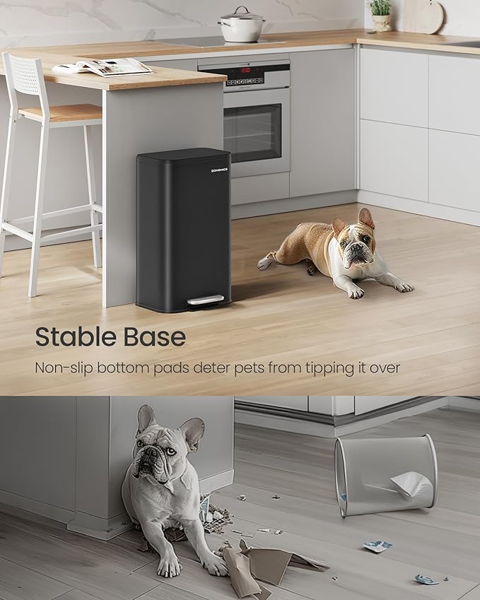 • [Durable and Stable] Made from robust stainless steel, this trash bin is resistant to rust, dirt, and is easy to clean. The base is equipped with non-slip pads to enhance stability, making it difficult for pets to tip it over