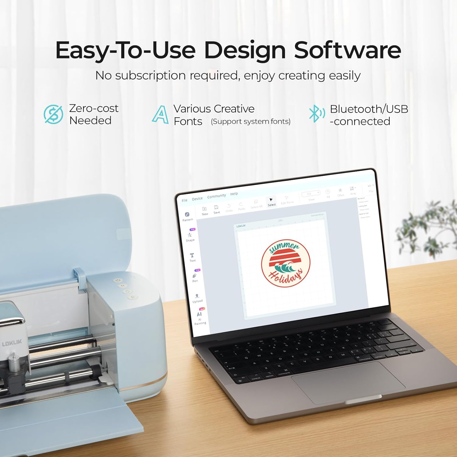 • SAY GOODBYE TO EXPENSIVE APP BILLS: Pairs with a all-access software LOKLiK IdeaStudio, you can use all the features of this cutting machine without subscription fee, get over 50,000 gratis designs and various creative fonts, which are constantly updated. Plus, built-in cutting-edge AI painting feature will help turning your fantasy into personalized designs in seconds. Unleash your creativity without the cost constraints