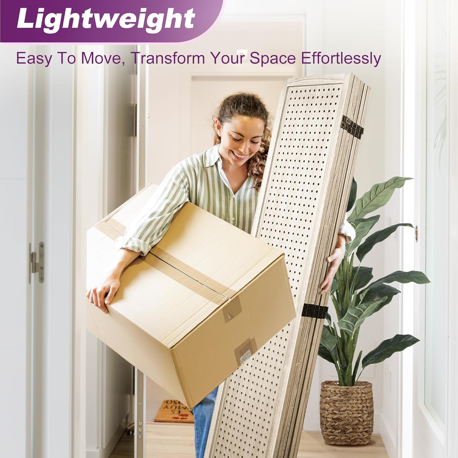 • Pegboard Display Design:This freestanding pegboard divider is an efficient solution for display and partition needs. Acting as a room separator, it allows you to maximize display space by inserting hooks or nails into the small holes, making it an ideal wall divider for room separation. Use it to hang lightweight items like clothes, hats, or bags, adding both functionality and aesthetic appeal to your room dividers and folding privacy screens setup.