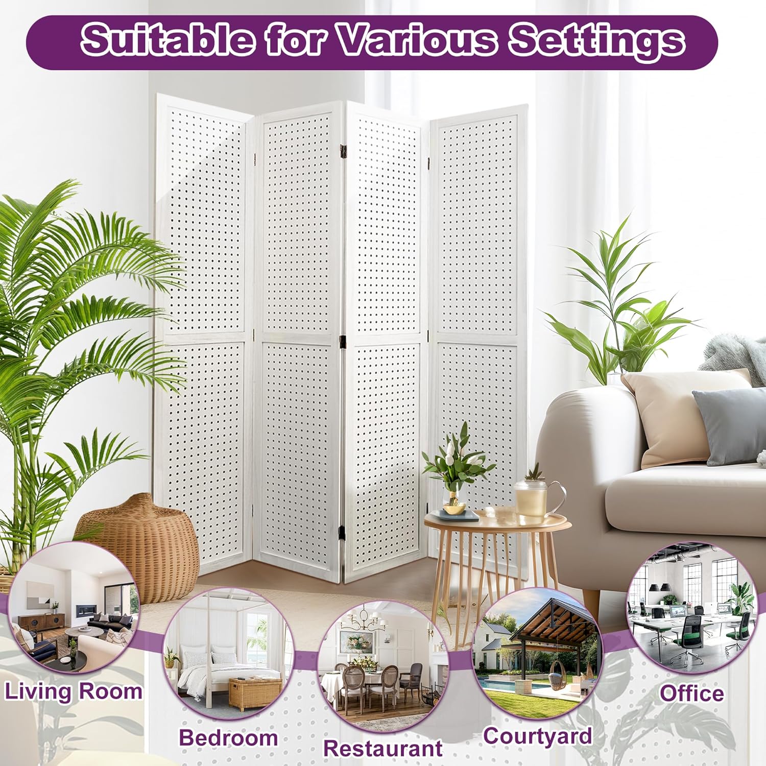 Room Divider, 5.6FT Folding Room Divider Panel, 4 Panel Pegboard Display Wood Partition Wall Divider for Room Separation& Craft Shows, White