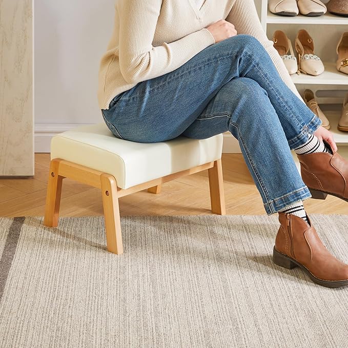 IBUYKE 10.2” H Small Foot Stool Ottoman, Rectangle PU Faux Leather Foot Rest with Padded Seat and Wood Legs, Modern Accent Ottoman Foot Rest for Living Room Bedroom Couch Office, White WBD013W