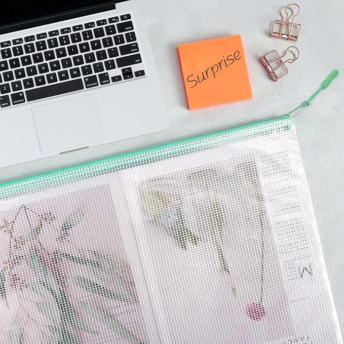 • PACKAGE INCLUDES: 20 pcs 17 inches * 12 inches / 43cm * 30 cm large size A3 mesh zipper bags in 8 different colors, also gives you label stickers, these label stickers and colors help you quickly distinguish and find what you need