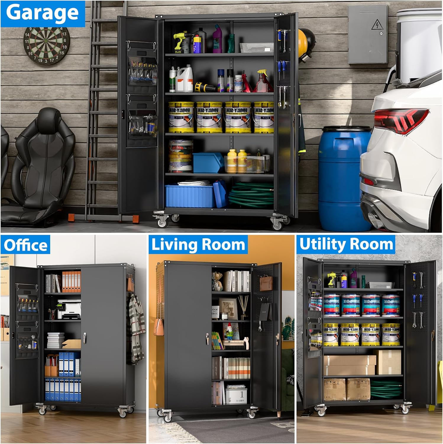 • [Garage&Home Storage Cabinet] Plenty of storage. "great garage cleanup".You can move them around as needed and the casters and wheels work great on all the different surfaces in your garage. Extra storage strong and fit your needs, it is sufficient for garage use. If your house literally has NO closets on the 1st, floor. you needed this metal storage cabinet for your board games, cases of water,as well as miscellaneous items. Rolls easily which is great when moving to a new home.