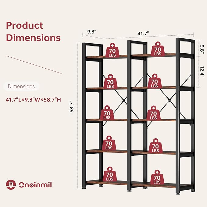 oneinmil Bookshelf 5 Tier, 58.7'' Industrial Book Shelf, Wooden Bookshelves with 10 Open Display Shelves, Vintage Storage Rack, Standing Wide Bookcase for Home and Office, Rustic Brown