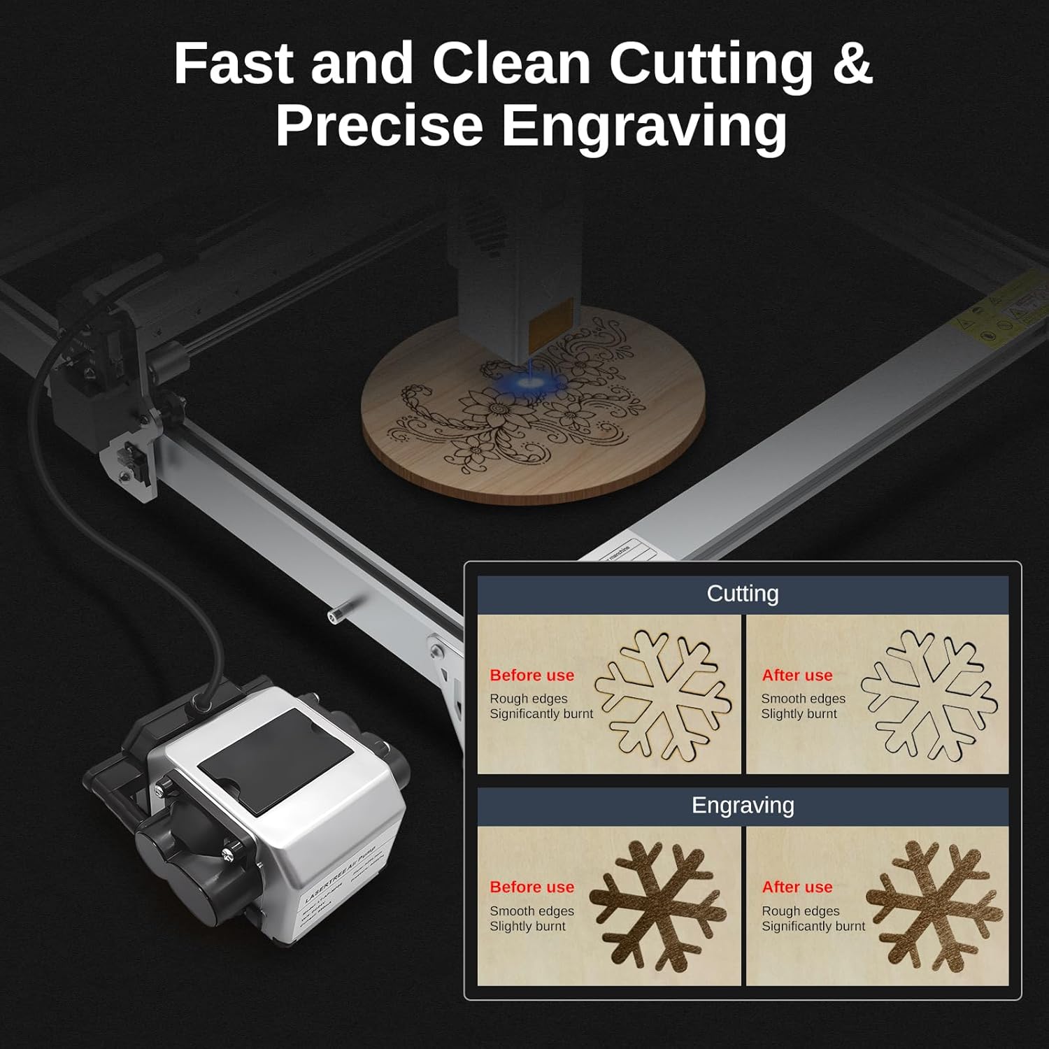 • Get a Clean Surface and Smooth Edge: The powerful air assist pump's airflow quickly reduces the surface temperature of cutting objects, helps minimize burning during cutting, prevents distortion and discoloration due to excessive burning, and makes the cutting edge smoother and cleaner.