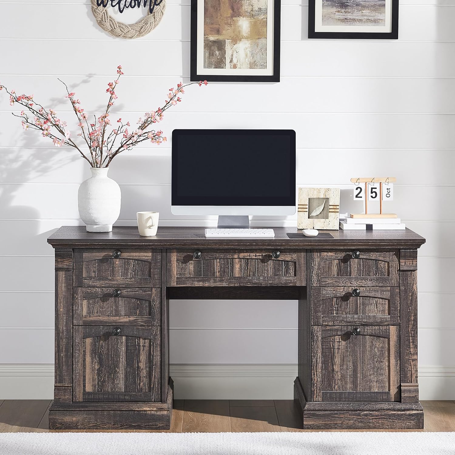 OKD 60" Executive Desk with Drawers, Farmhouse Home Office Desk with Charging Station, Keyboard Tray, File Cabinet Storage, Wood Computer Desk for Work and Study, Dark Rustic Oak