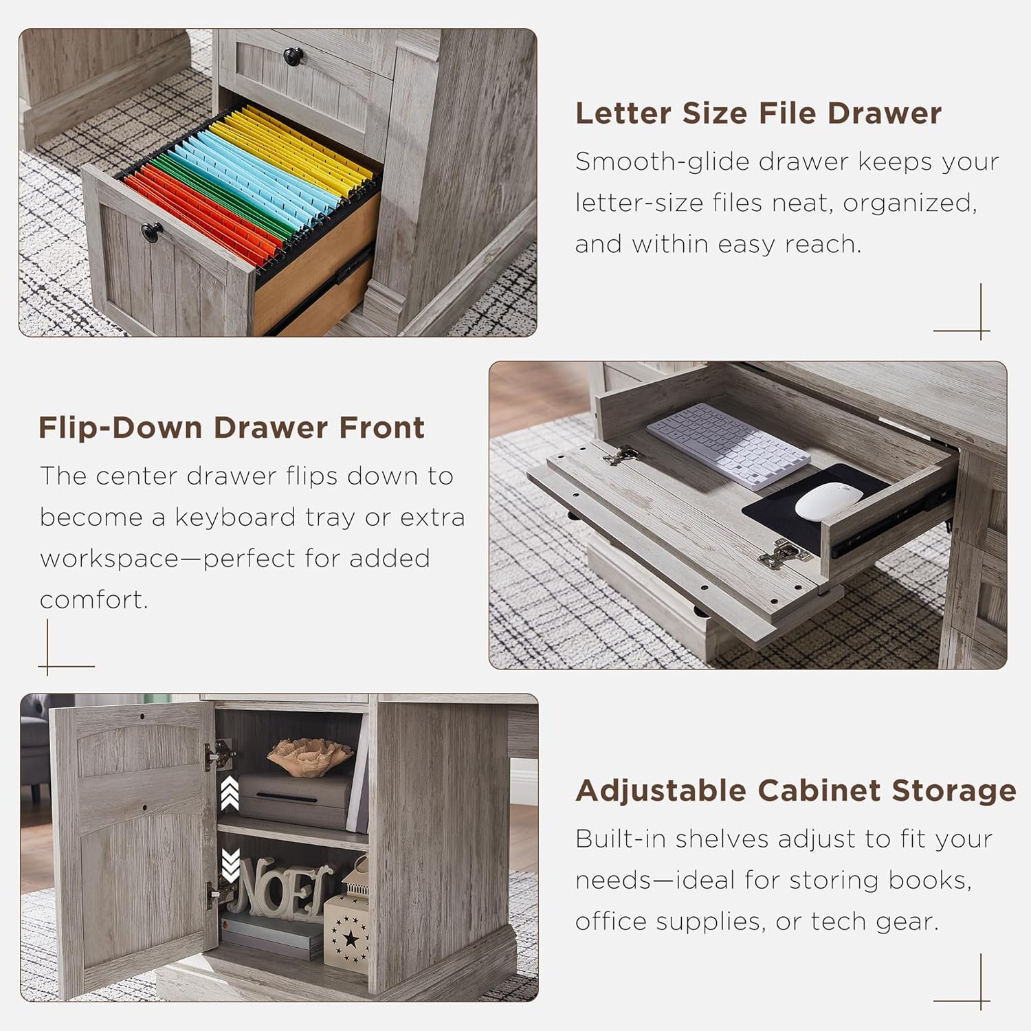 • Ample Storage for a Tidy Workspace: Keep your office organized with a large file drawer for letter-size documents, three utility drawers for supplies, and a cabinet with an adjustable shelf. A dedicated compartment also fits a vertical CPU tower—so everything has its place and stays out of sight.