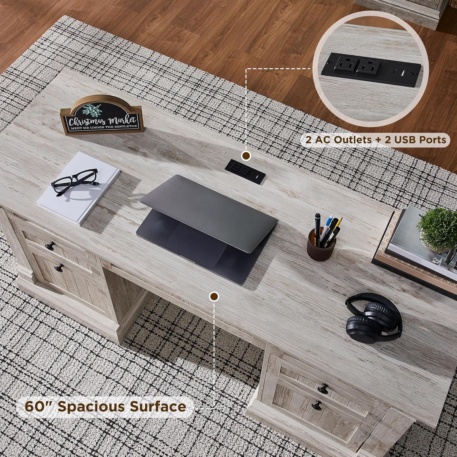 OKD 60" Executive Desk with Drawers, Farmhouse Home Office Desk with Charging Station, Keyboard Tray, File Cabinet Storage, Wood Computer Desk for Work and Study, Antique Brushed White