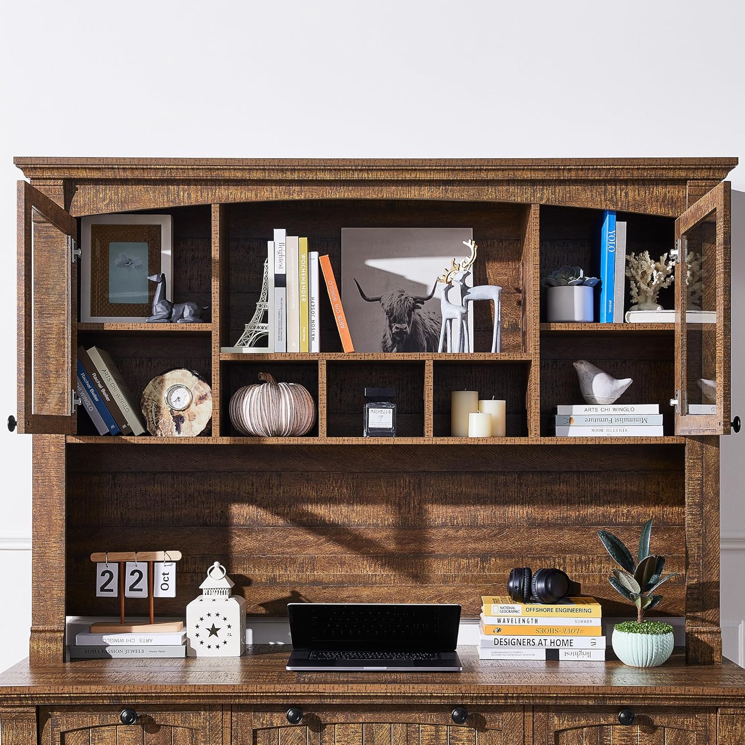 • Exceptional Storage Capacity: The upper hutch features two glass-front cabinets, open cubbies, and display shelves—ideal for organizing books, décor, or office supplies. Below, the desk offers a file drawer for letter-size documents, three utility drawers, and a concealed cabinet with an adjustable shelf to keep everything neat and within reach.