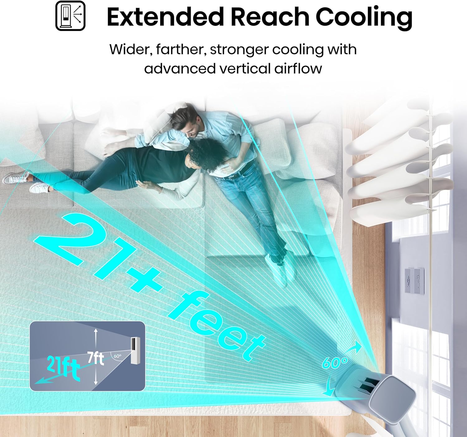 • Extended Reach Cooling – A high-performance vertical cross-flow fan propels cool air up to 21 feet with a 60-degree wide coverage, ensuring rapid and even cooling across larger spaces.