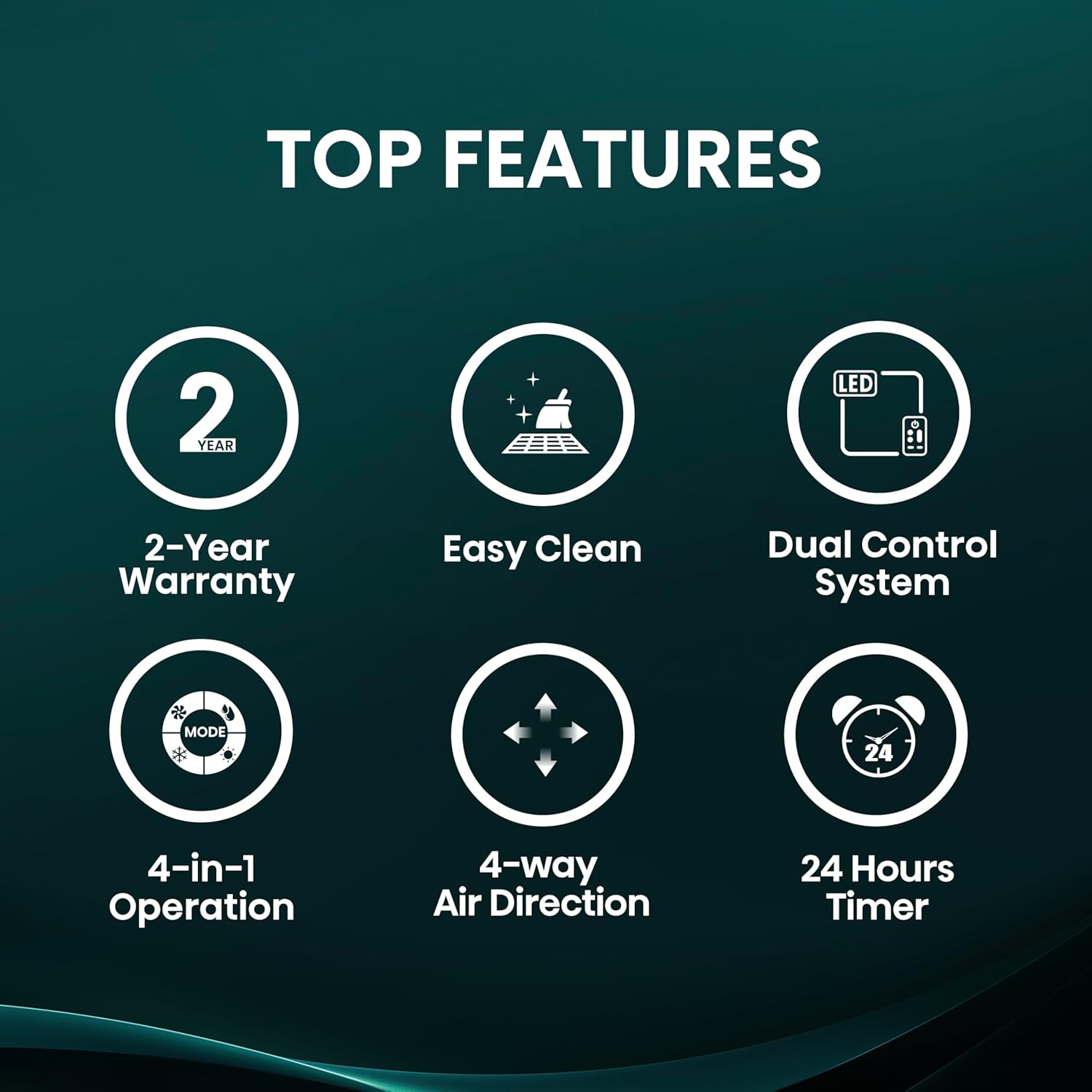 • Intuitive Dual Control System – Adjust the temperature, fan speed, and modes with ease using the user-friendly control panel or the convenient remote control, giving you total comfort at your fingertips.