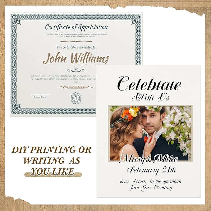 • Work As Different Things: these plain certificate papers are flexible in use, you can use them as certificate printing, wedding invitation, birthday invitation, restaurant menu, theme party decoration and so on, running smoothly in laser and inkjet printers, copiers and offset applications without jams