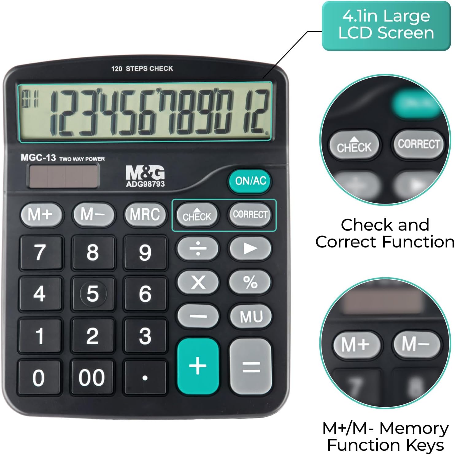 M&G Desk Calculator 12 Digit Office Calculators with Check & Correct, Dual Solar Power and Battery, Large LCD Display Business Calculator with Big Buttons Black