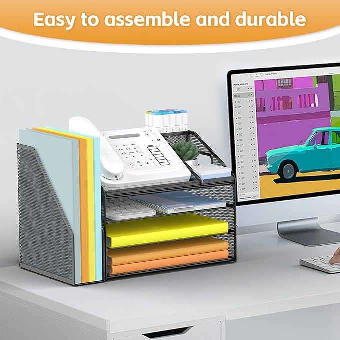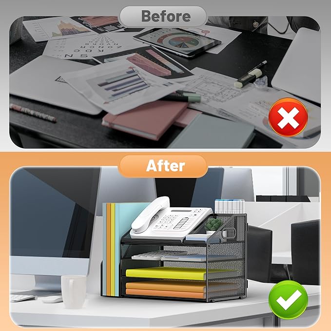 • 4 Tier Organization with Pen Holder: This desk organizer boasts a 4 tier design for efficient sorting of your papers, letters, and other office supplies, along with a dedicated pen holder. It's perfect for maintaining a tidy and uncluttered workspace. The desk file organizer is an essential desk accessory that contributes to an orderly and professional atmosphere