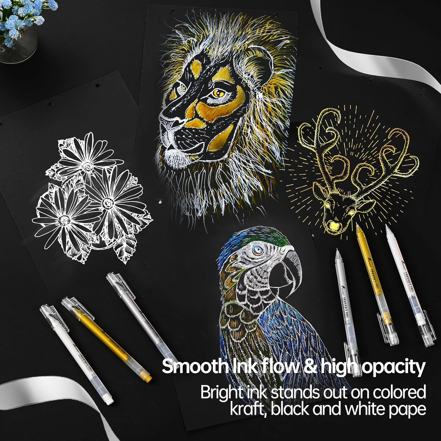 • MULTI-PURPOSE: Writes on dark paper such as black paper, craft paper. White Gold and Silver fine point gel pens for detail drawing sketching coloring, illustration, card making, scrapbook and other projects