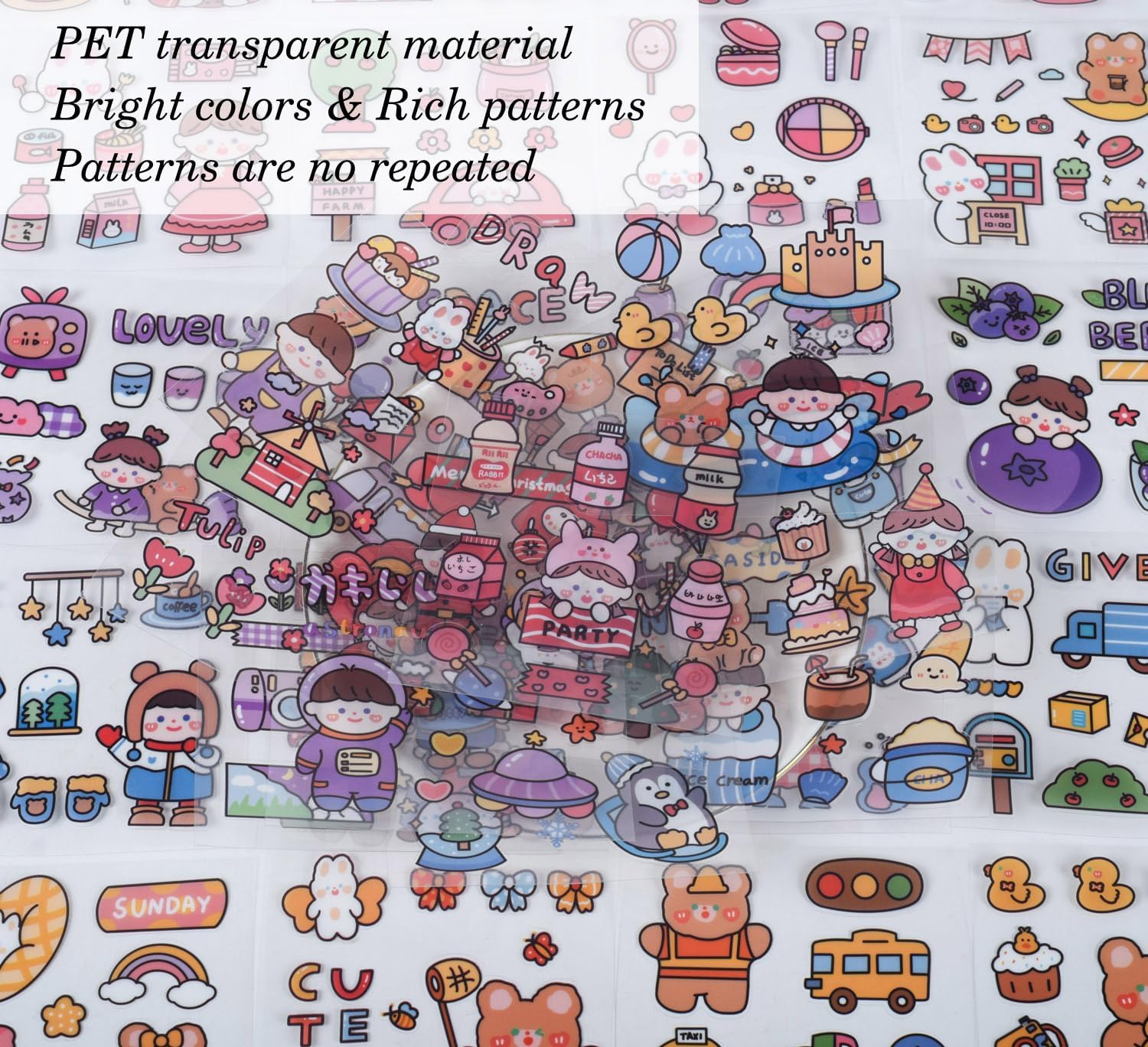 Cute Cartoon Kawaii Scrapbook Stickers - 100 Sheets Transparent Sticker for Junk Journal Planner Album Calendars Notebook DIY Craft Decor