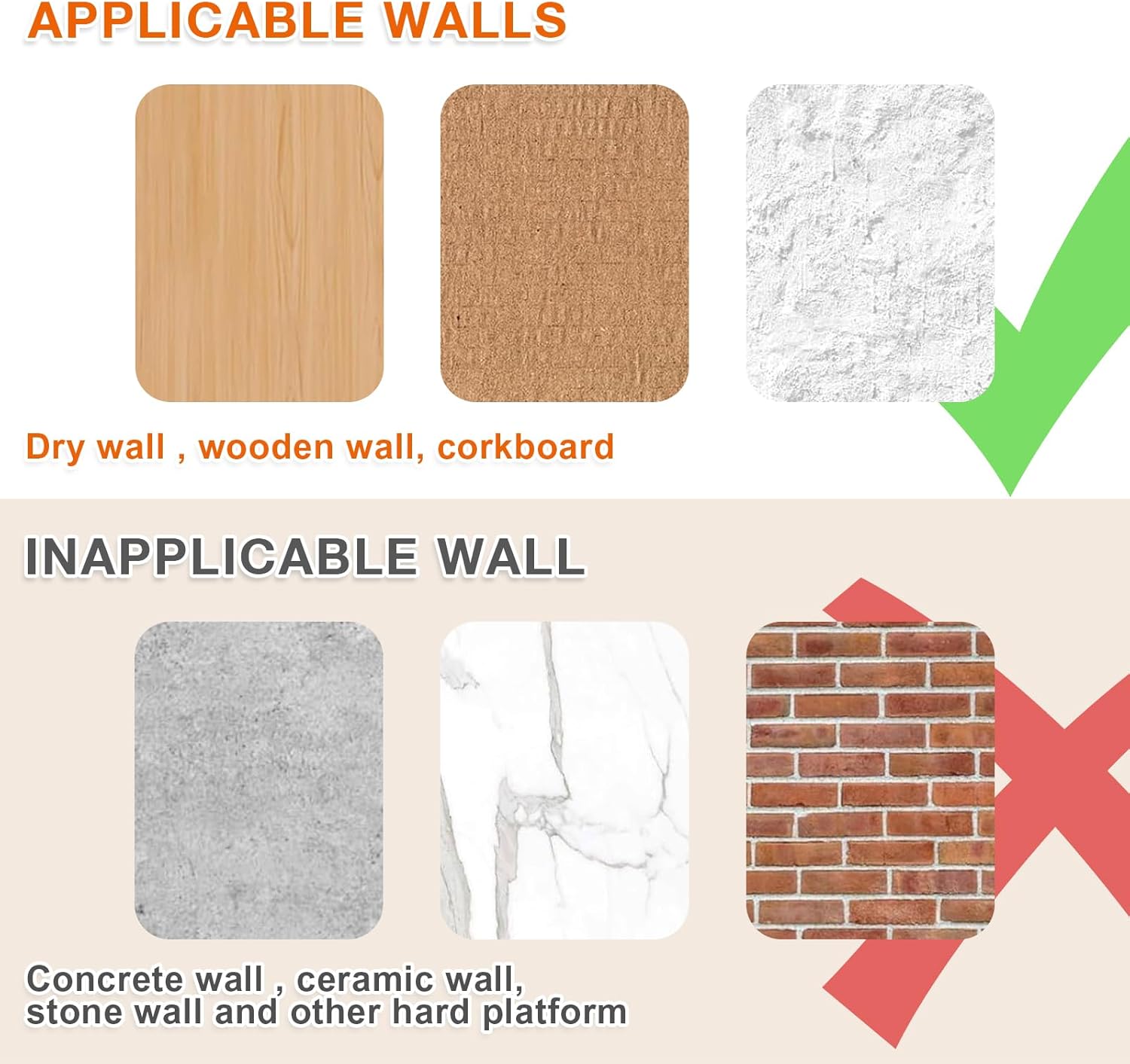 • TRACELESS THUMBTACKS: The holes made by the Hang pictures on wall without nails are very small and almost leave no marks, which can avoid damaging the walls. The picture hangers enable you to create beautiful displays without leaving a lasting impact. Please consider the hardness of the wall before purchasing. Our wall hooks for hanging may not be suitable for very hard or fragile materials, so be sure to evaluate the wall type in your home for the best results.