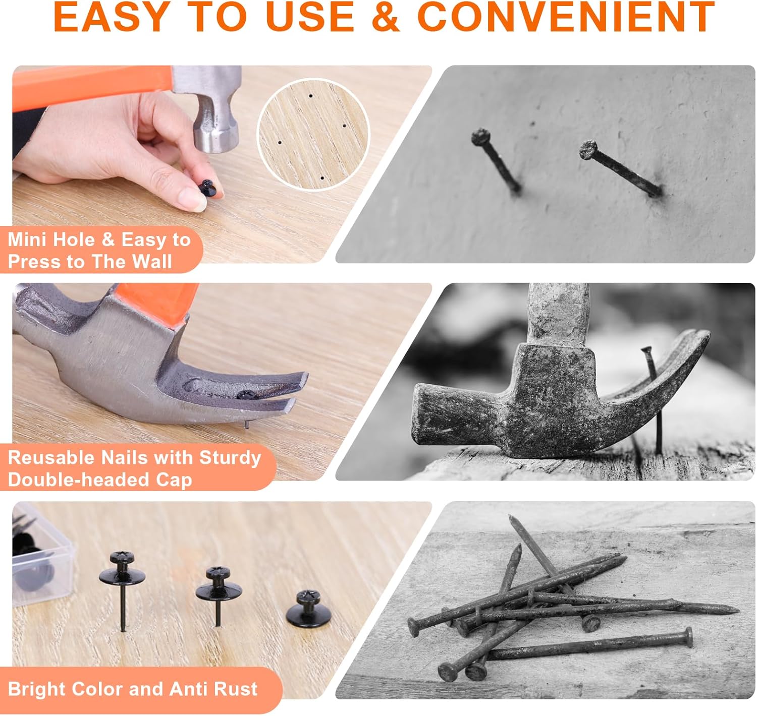 • THUMBTACKS FOR STABLE STRUCTURE: The picture hanging kit are designed with double heads, and the second head provides strong support for the nails for hanging pictures, making it easier to hang heavier objects on the wall without slipping or falling off. Each wall nails for hanging can safely support up to five pounds.