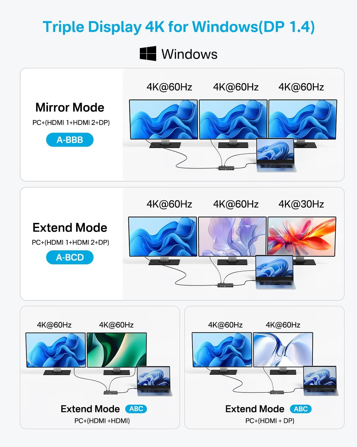 • Laptop Docking Station Triple Display: This usb c to DP/HDMI adapter supports single 4K@60Hz display and triple 4K@30Hz displays(under DP1.4). ONLY Windows system support MST and SST(Mirror & Extend Mode). MacOS system DOES NOT support MST
