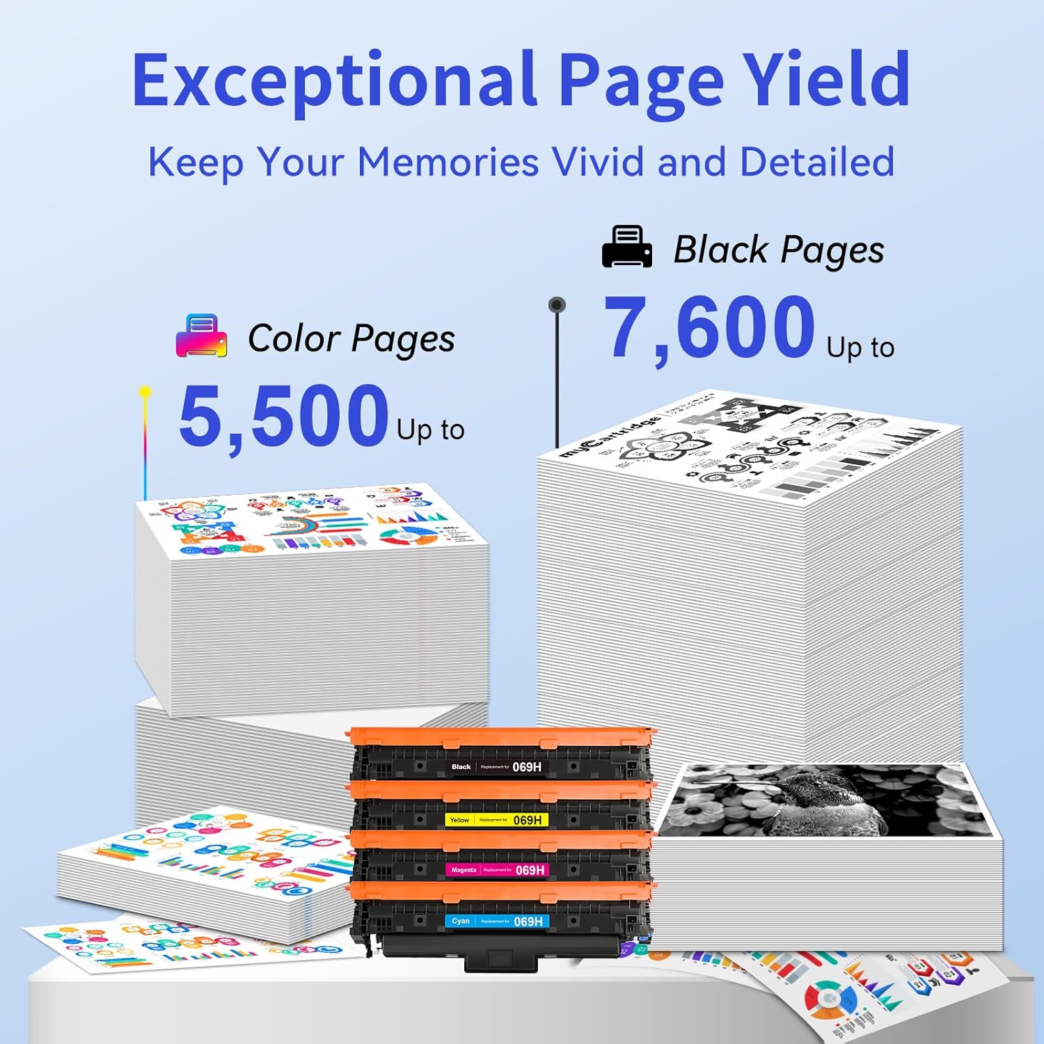 • High Page Yield: Up to 7,600 pages per 069H black toner cartridge, Up to 5,500 Pages per 069H cyan magenta yellow toner cartridge at 5% coverage of A4 Paper