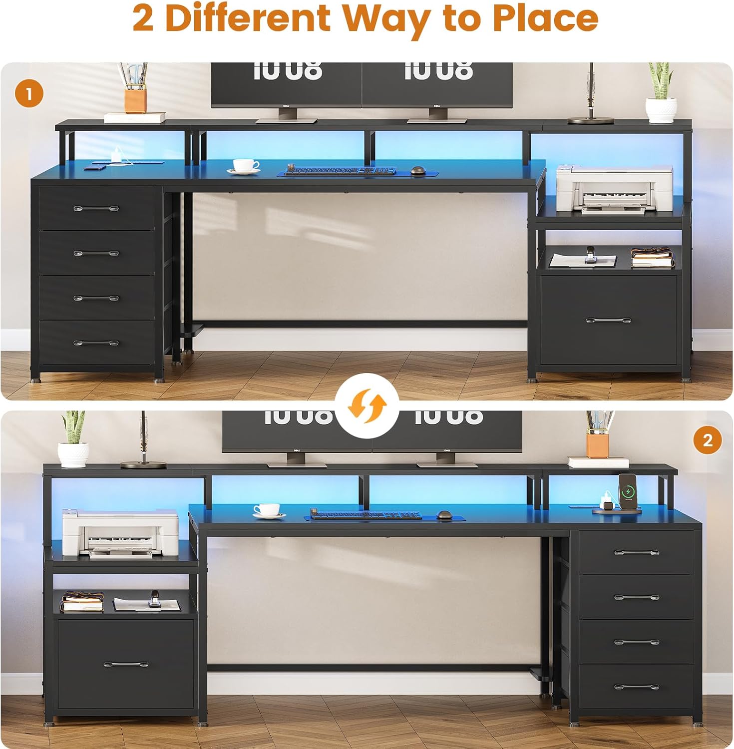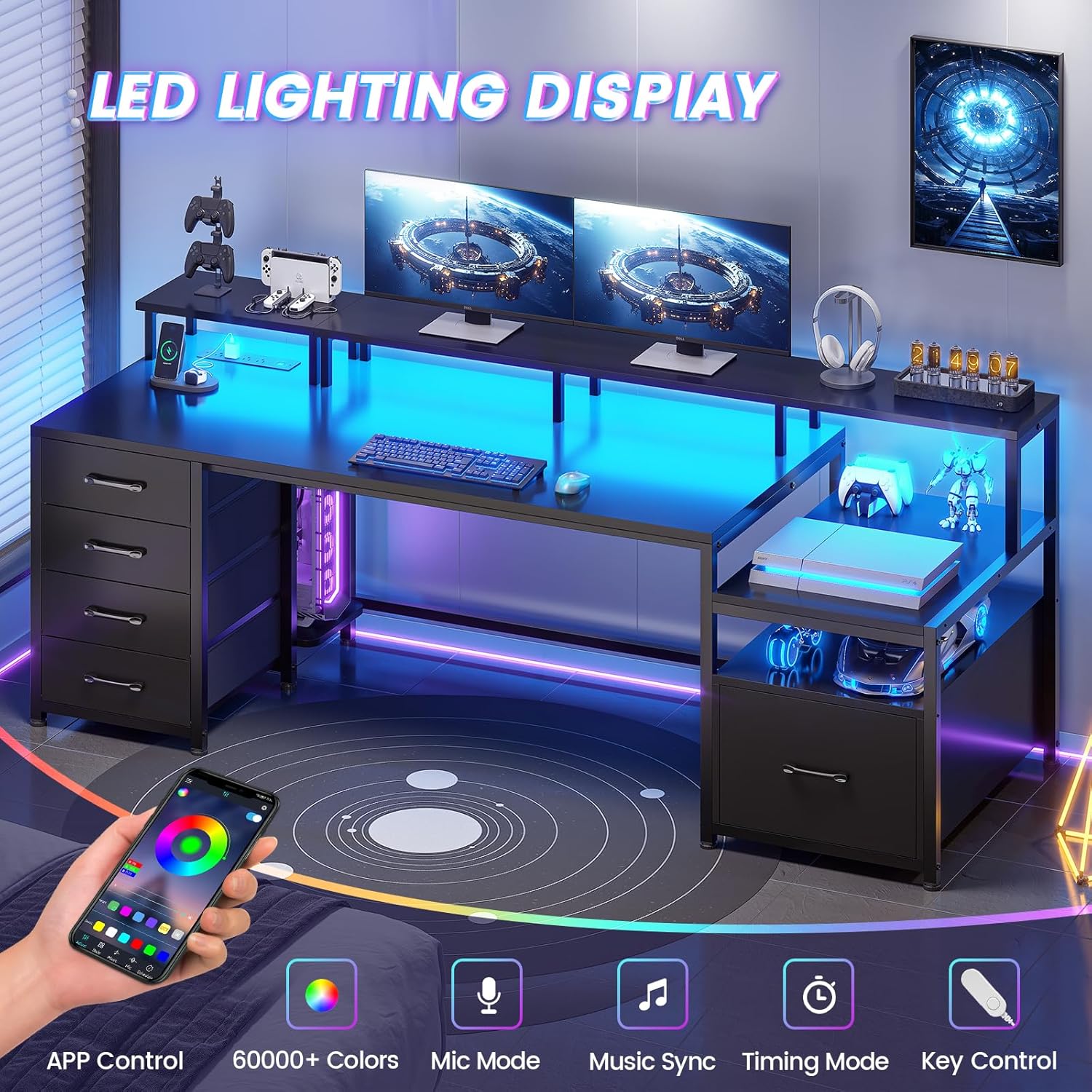 SEDETA 75'' Computer Desk with 5 Drawer, Power Outlet & Led Lights, Home Office Desk with File Drawer, Storage Shelves, Printer Cabinet and Monitor Shelf, 23.6" W Large Desktop Gaming Desk, Black