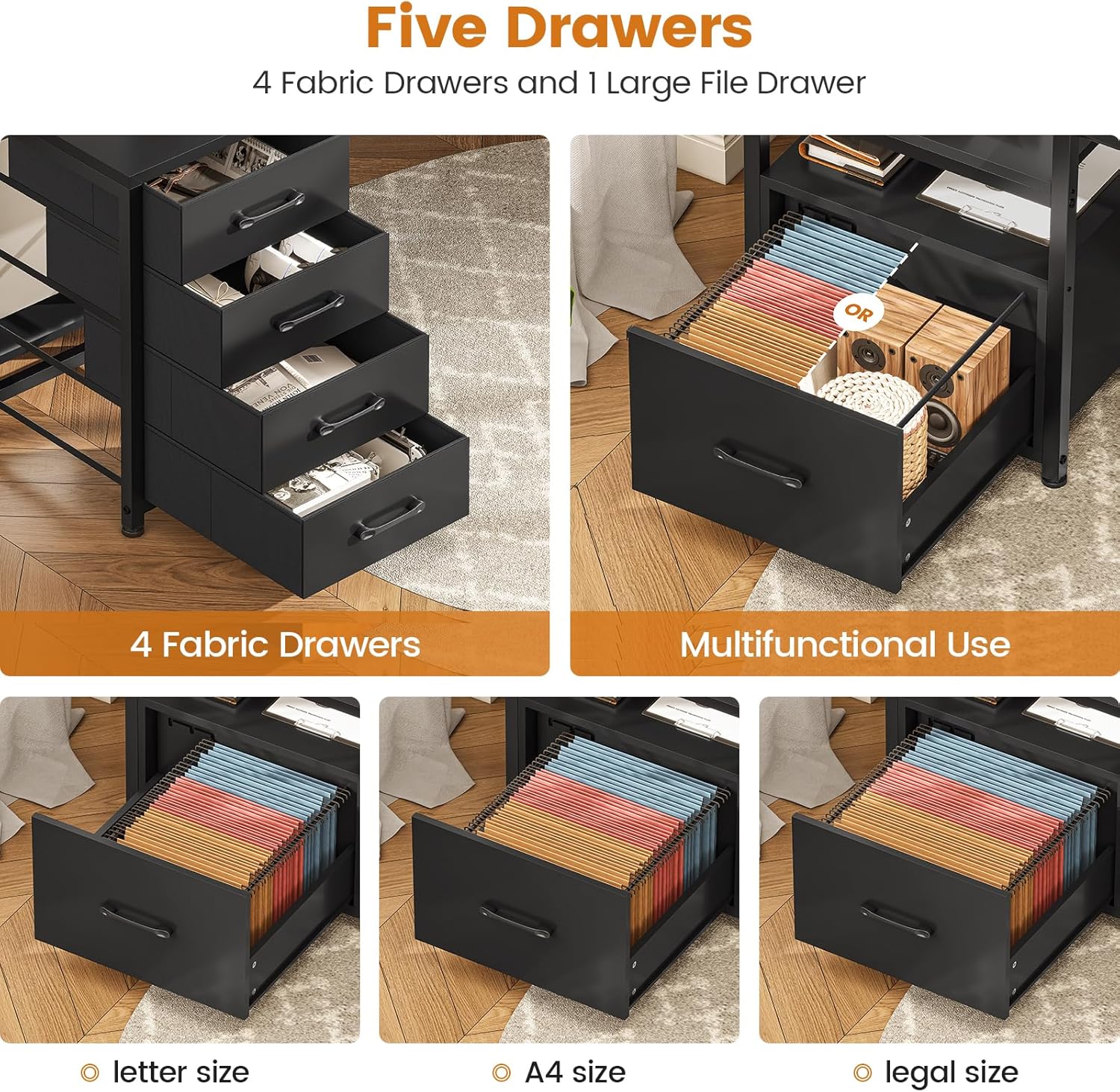 • 【5 Large Storage Drawers】Coming with a file drawer, fabric storage drawers, printer cabinet and open shelves with powerful storage space. File cabinet can hold letter/A4/legal files. This solid constructed computer desk could hold printers, scanners, fax machines and any other office machines, keeps printer or scanner within easy reach of your desk to free up work space.