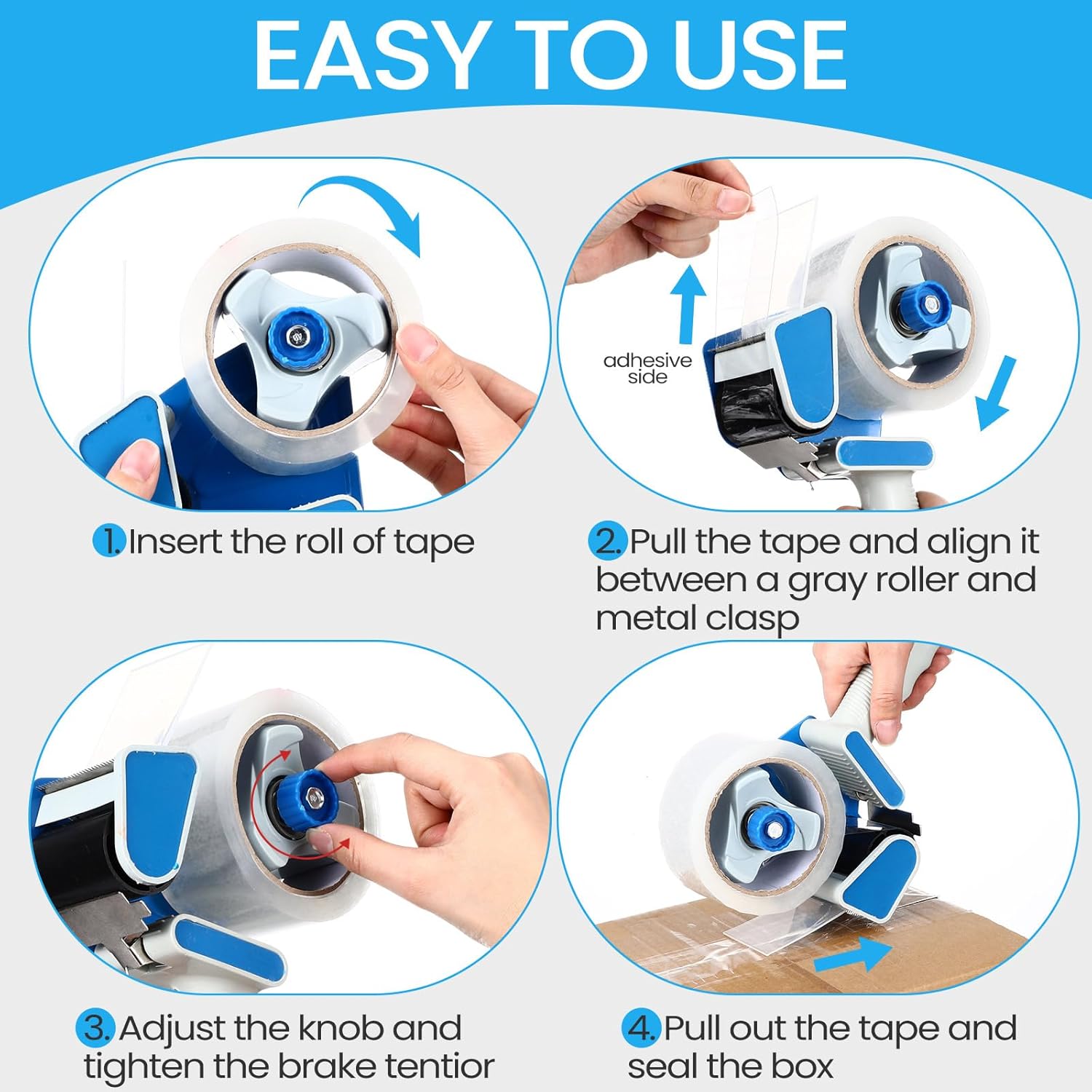 • Easy to Use: our packaging tape with dispenser is safe and simple to use; Place the tape on the roller, tear the tape, and thread one end through the metal sheet; Is ready to use; After it makes sealing multiple package easily without losing many time