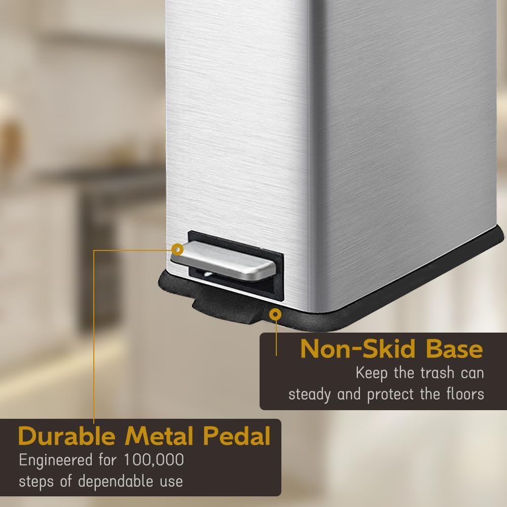• Stable & Anti-Slip: Non-skid base keep your trash can firmly grounded, no matter the floor. And the strong steel pedal is engineered to last over 100,000 steps.
