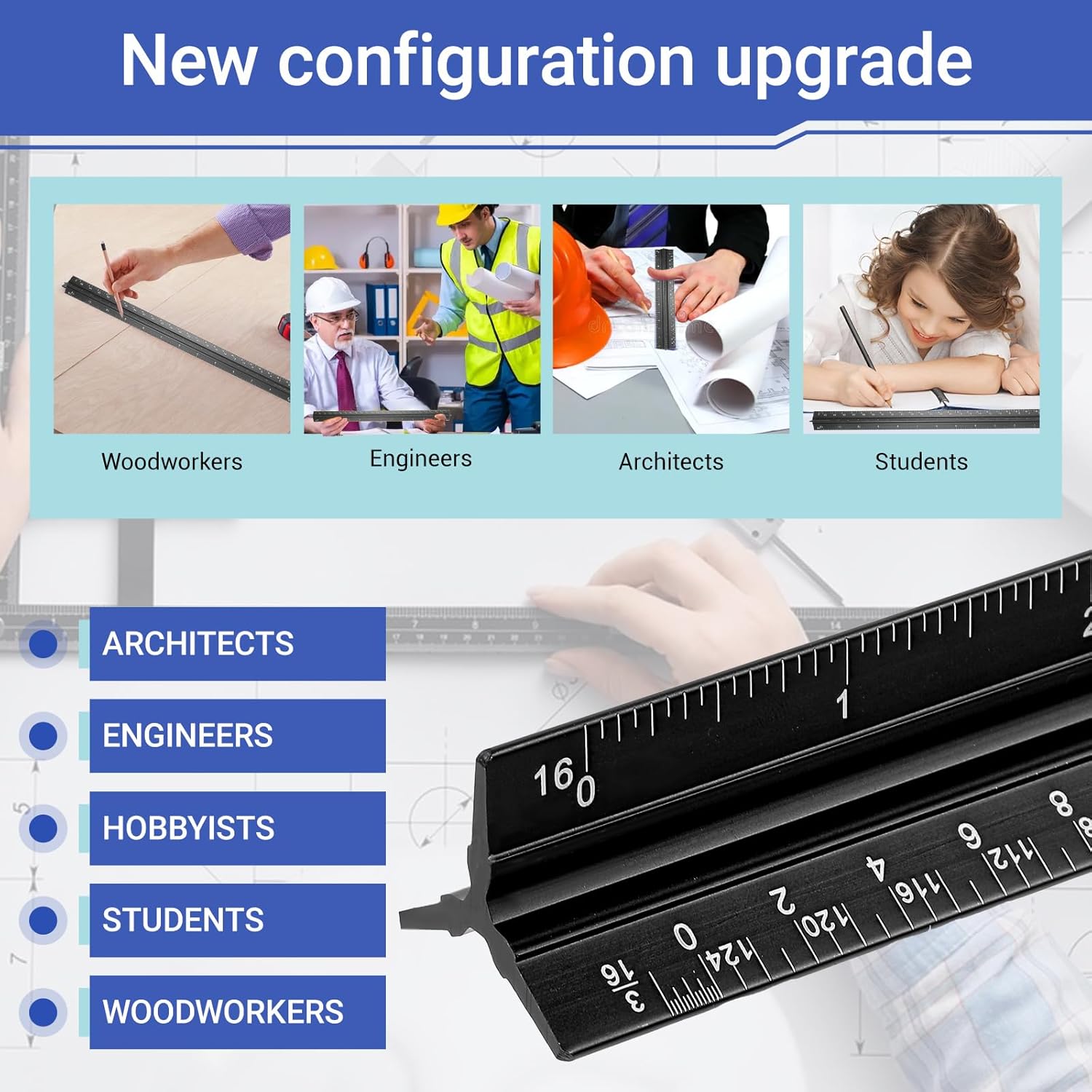 • Three-sided Scales: the size of each engineering ruler is approximately 32.5 x 2.55 x 2.25cm, and the three-sided scales include 16, 3, 1-1/2", 1, 3/4", 1/2", 3/8", 3/16", 1/4", 3/32" and 1/8", a professional-grade tool with extremely high precision