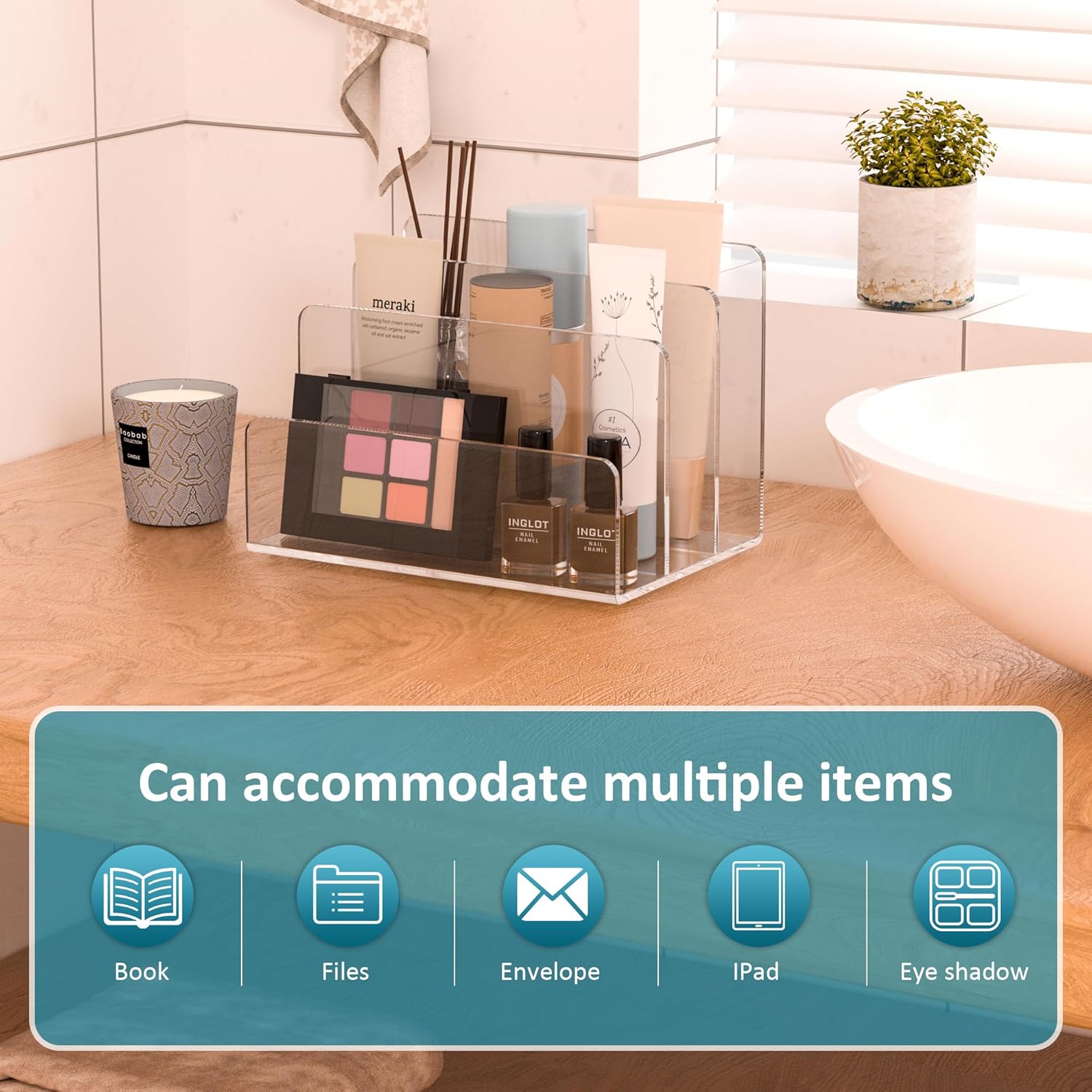 • Wide Application: The acrylic holder can be used for so many items display. It can be used for files, envelope, documents, magazines, phone, letters in your office. Or you can use it for cosmetics,Ipad, vinyls, eye shadows, makeups in your home. Multifunctions for your goods organizer.
