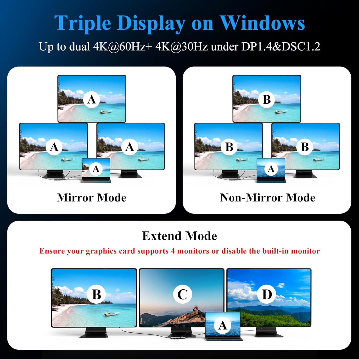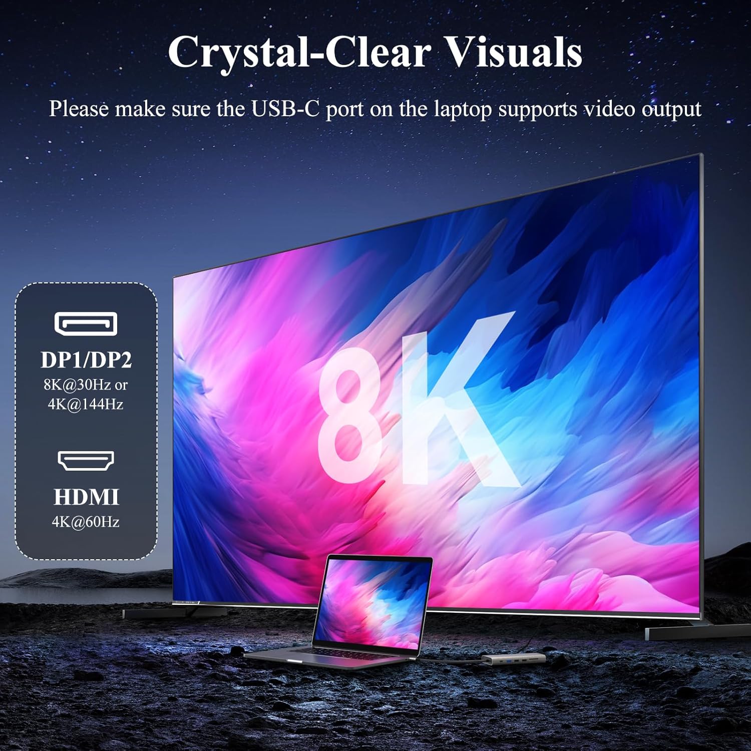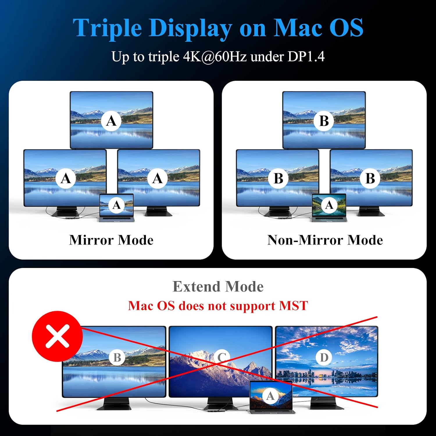 • ★ Docking Station 3 Monitors: Laptop Docking Station DP*2 8K 144HZ & HDMI 4K 60HZ, docking station dual monitor dual monitor for visual creators and gamers, usb c dock delivers ultra HD images with triple 4K (under DP1.4 & DSC1.2) through HDMI and DP1/DP2 ports,Ensure your laptop's USB-C port supports video output. Note: Multi-Stream Transport (MST) is not supported on Mac laptops. Displays connected via HDMI/DP/VGA (if those video ports are available) will mirror the same image