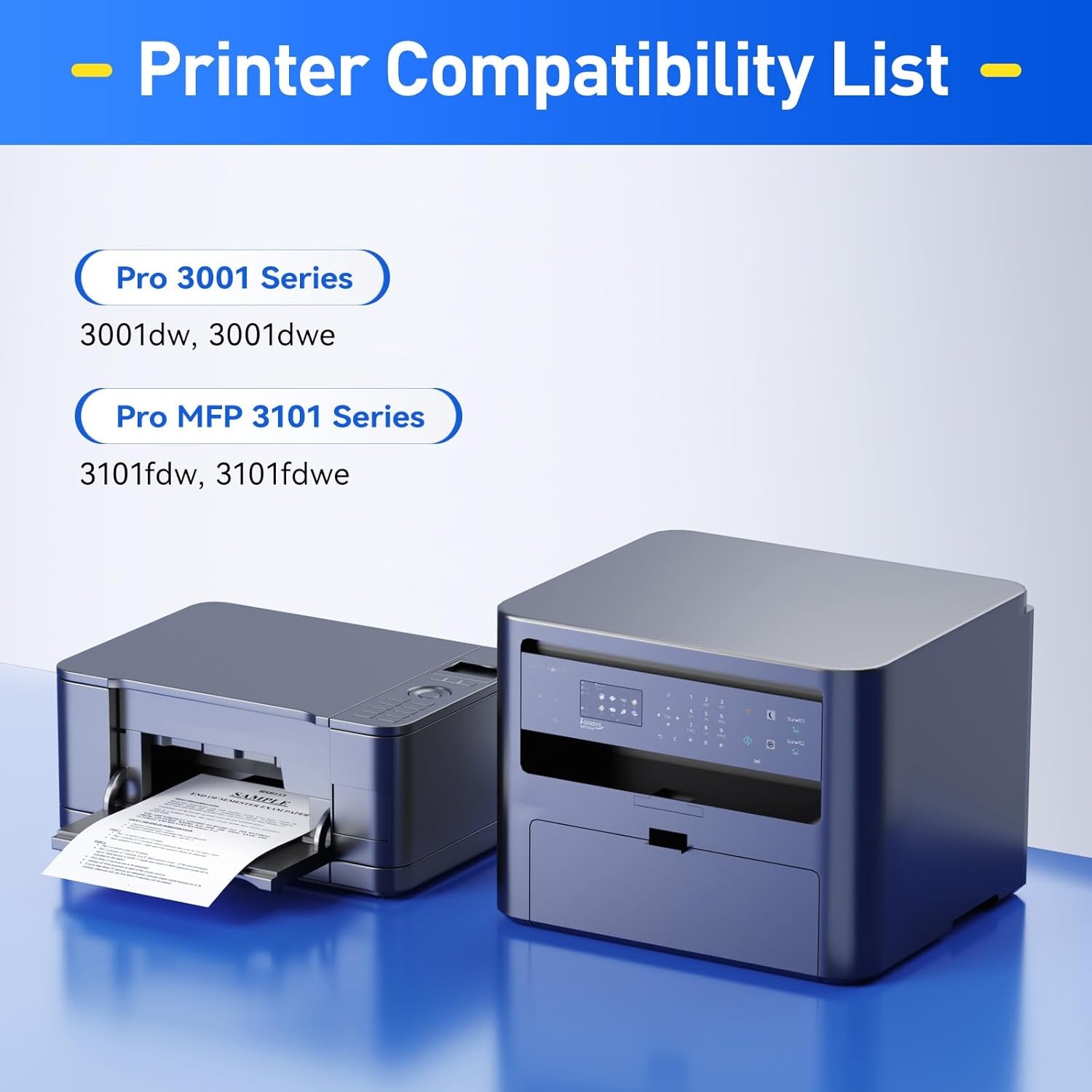 • Compatible Printers: Compatible with HP LaserJet Pro 3001dw 3001fdw MFP 3101fdw toner printer. NOT Compatible for Suffix with Letter "e" such as:Pro MFP 3001dwe mfp 3101fdwe Series Printer.