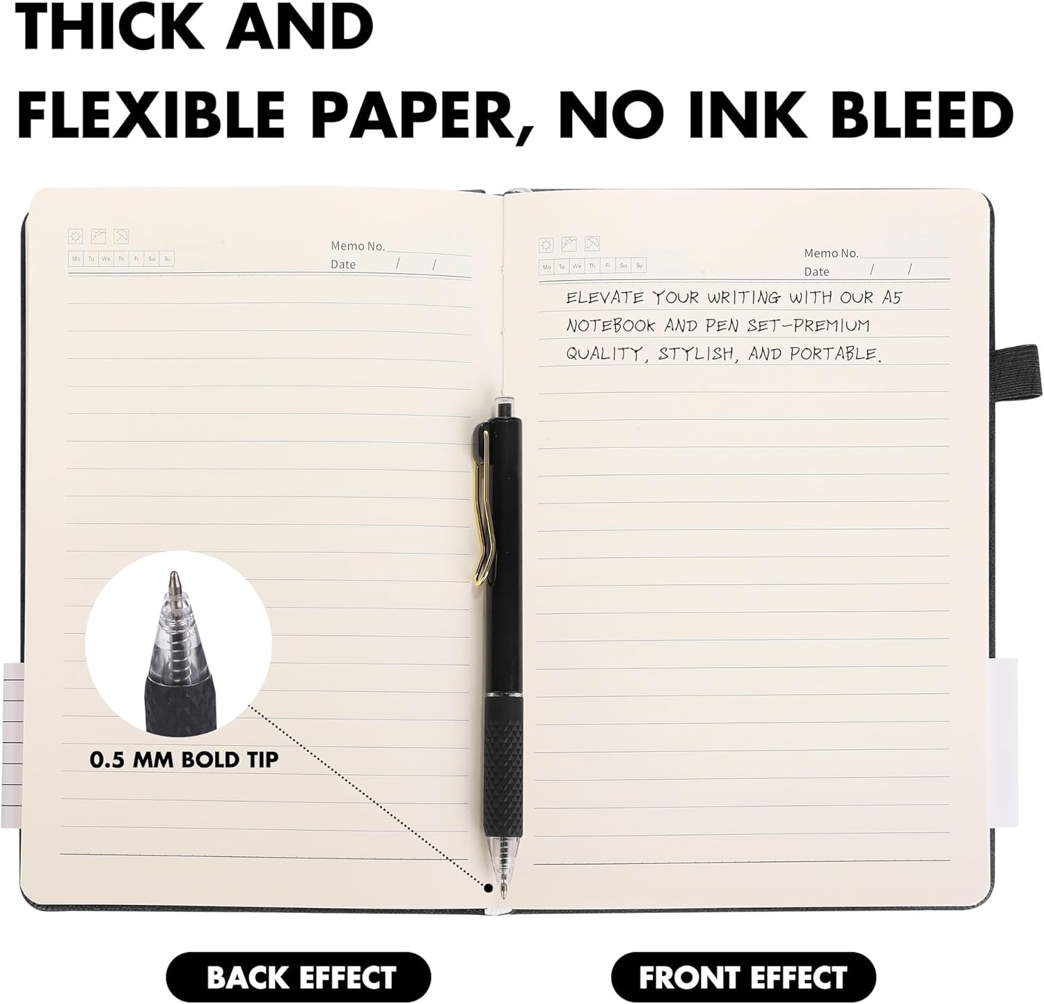 • Quality leather & paper: our A5 notebooks are made of 100 gsm thick paper, providing a smooth touch and resisting ghosting and bleeding, compatible with most pens, pencils and markers; the lined journal notebook with pens feature premium PU leather hardcover, waterproof and easy to clean, helping the notebooks stay upright without the pages curling or bending; the ballpoint pen is designed with a 0.5 mm bold tip for smooth, non-leaking drawing, ideal for use with the journal